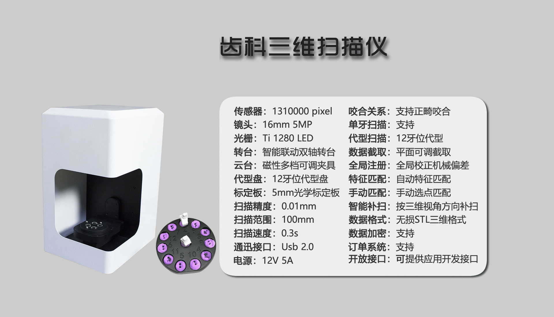 1、全自動掃描 ,省時省力:全自動進行掃描,操作簡單方便,只需一個按鍵就可輕松獲取數據,省時省力。2、高精度,滿足多種專業領域的數據要求:拍照式測量的方式,提供高精度、高質量的標準STL數據,精度小于